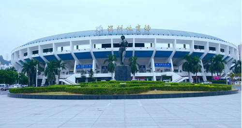 深圳體育館[是深圳市政府于一九八五年投資興建的。他的建筑呈正方形,造形宏偉、堅實。銀白色的建筑總體,在濃綠的筆架山映襯下,顯得分外鮮明、突出。特別是那四根拔地而起的立柱,支撐著巨大的棚頂,頗具頂天立地之氣度。