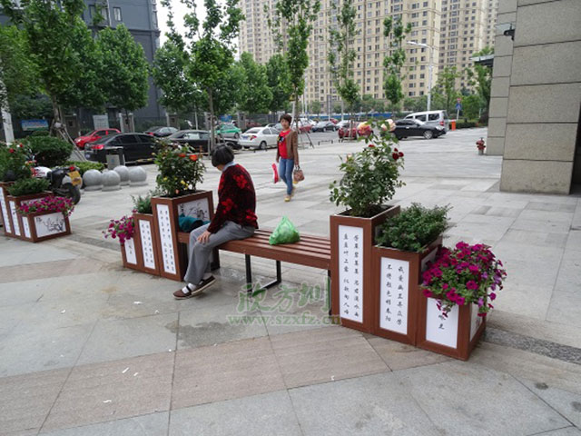 欣方圳市政塑木花箱最大的優(yōu)點(diǎn)就是在美化了環(huán)境的同時(shí),還增加了其使用年限,有限的防止了浪費(fèi)木材,側(cè)面的等于對(duì)環(huán)境做出了貢獻(xiàn)。另外欣方圳的塑木花箱有限的防止了蟲(chóng)蟻等的破壞,很多孩子容易被美麗的鮮花所吸引,會(huì)離花箱很近,但普通實(shí)木花箱時(shí)間久,會(huì)被腐蝕,里面有很多螞蟻,蟲(chóng)子,很不衛(wèi)生,而塑木花箱能有效的防止這一缺憾。還能夠滿足客戶對(duì)各種規(guī)格、尺寸、形狀、厚度的需求,同時(shí)也可提供多種設(shè)計(jì)、顏色及木紋。還具有與原木相同的加工性能,可釘、可鉆、可切割、粘接,用釘子或螺栓連接固定,表面光滑細(xì)膩、無(wú)需砂光和油漆。而其油漆附著性好,亦可根據(jù)個(gè)人喜好上漆。就例如圖上這款花箱上面還能應(yīng)客戶要求描繪中國(guó)魅力的風(fēng)格。