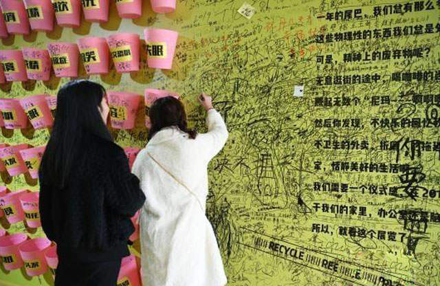 除了這些垃圾收集裝置,垃圾箱內(nèi)的三面?zhèn)葔偷孛嬉渤蔀槭忻裥沟钠脚_(tái),寫(xiě)滿了戳心的留言。如“扔掉和我媽的溝通不暢”“2018我抑郁癥了,話更少了,希望你不要離開(kāi),一起去馬來(lái)西亞”……字字句句都反映出當(dāng)代年輕人的生活壓力,以及對(duì)輕松、快樂(lè)的渴望。
