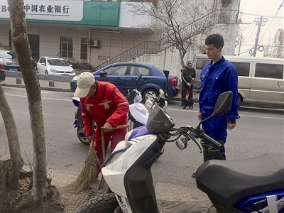 一套藍色工裝、一副護膝,外加一輛帶有環(huán)衛(wèi)標志的電動自行車,就是他的全部行頭。從進入環(huán)衛(wèi)系統(tǒng)開始,除去輪休,幾乎每天他都要騎上這輛電動車,到其管轄的天臺路與田家花園社區(qū),巡視3至4遍。