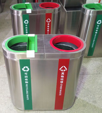 不銹鋼商場高檔垃圾桶采用304#不銹鋼定制,桶身邊緣圓角防撞設計,絲印垃圾分類標識及對應上方桶頭顏色,分類醒目,垃圾投放更合理。