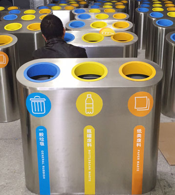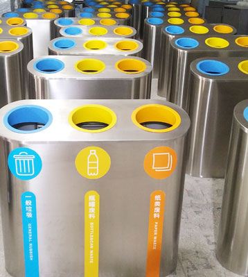地鐵不銹鋼三分類垃圾桶整體橢圓設計,避免不經意的磕碰對人身造成傷害,黃橙藍三色分類投口與桶身分類標識顏色一致,有助于從源頭精準垃圾分類投放。