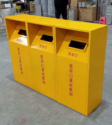 廢棄口罩垃圾桶回收箱整體方形黃色設(shè)計(jì),用于疫情期間廢棄口罩垃圾產(chǎn)生量大收集處理,既美化了城市環(huán)境清潔,也有效阻斷病毒的傳播,開(kāi)學(xué)校園需求量大。
