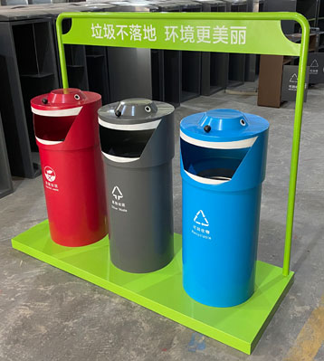 • 產品材質:戶外卡通三分類垃圾桶采用優質冷軋鋼材料經剪鈑下料、折彎、沖壓、焊接、打磨、等工藝:表面經過除油、噴砂防銹處理后,再進行酸洗磷化處理;表面清理干燥后整體進行靜電噴涂或烤漆處理,靜電噴涂是經過流水線高溫固化爐固化后再出爐冷卻,加工后的塑粉附著力強,不易剝落;
