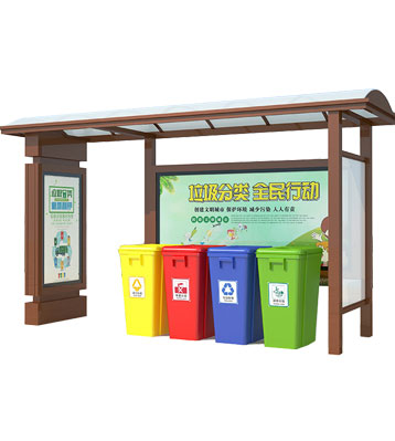 設有擋雨棚,可配備垃圾箱信息顯示屏、防水照明燈、廣告屏,進行地面硬化。對社區玻金塑紙可回收物,其他垃圾,廚余垃圾,有害垃圾等生活垃圾定時定點投放收集.