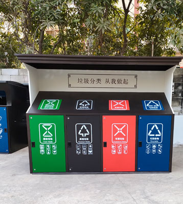 桶身與投口顏色對應,不同垃圾分色烤漆,垃圾分類標識清晰醒目,有助從源頭做好精準垃圾分類!推蓋投口設計,垃圾投放后自動復位密閉清潔無異味,是城市花園小區分類垃圾定點投放垃圾屋房站點