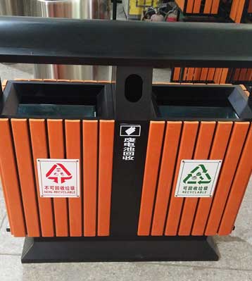 桶身采用防腐、防水、防蛀的高檔木料精致而成,桶架采用冷軋鋼板噴粉高溫烤黑色戶外漆,桶身垃圾分類標識引導投放,中間部位有害物投口設計。