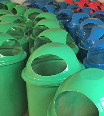 多投口玻璃鋼圓形垃圾桶桶身和內膽部分,采用高級玻璃鋼材質一次成型,經過打磨、除塵 、噴漆等一系列后期工藝然后出成品。
