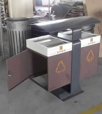 • 產品材質:欣方圳戶外鋼板分類垃圾桶采用優質冷軋鋼材料經剪鈑下料、折彎、沖壓、焊接、打磨、等工藝:表面經過除油、噴砂防銹處理后,再進行酸洗磷化處理;表面清理干燥后整體進行靜電噴涂或烤漆處理,靜電噴涂是經過流水線高溫固化爐固化后再出爐冷卻,加工后的塑粉附著力強,不易剝落;